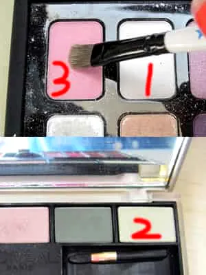 选择珍珠色(1号)、淡绿色(2号)、淡粉色(3号)眼影。