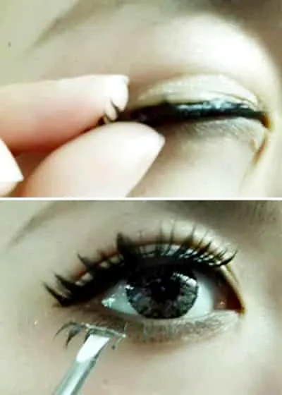 沿着画好的眼线粘贴假睫毛,下睫毛的尾部也要粘贴。