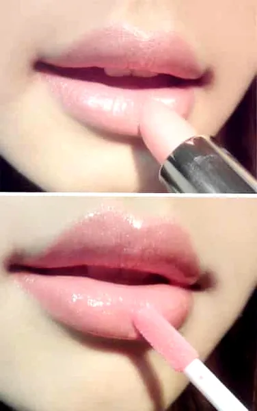 最后用裸粉色唇膏遮盖原本红润的唇色,再用粉色唇彩点缀。