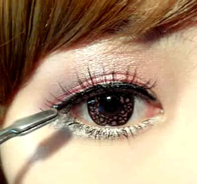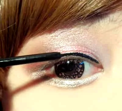 从眼头沿着睫毛根部画粗眼线,到眼尾处时可适当拉长。