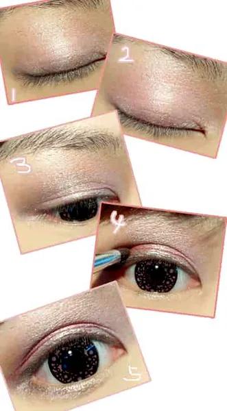 首先用米色眼影在整个眼窝处提亮,再用粉色眼影晕染眼窝,利用灰色眼影在双眼皮处推开,再使用粉色眼影在双眼皮的地方画出一道线来,最后在下眼睑的尾部刷上灰色眼影衔接上眼皮的色彩。