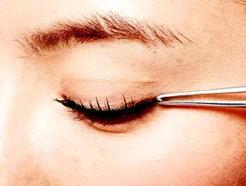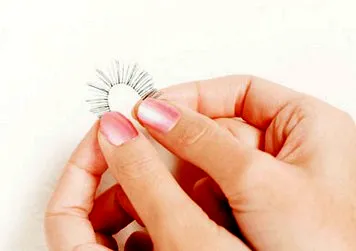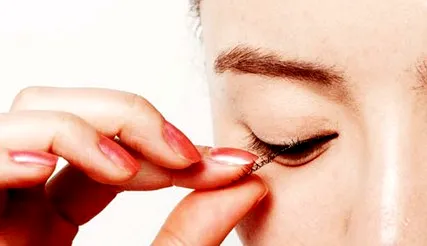 Step1:粘假睫毛之前首先要用手捏住睫毛的两端,向中间轻轻弯曲,多弯曲几次后,假睫毛的连接梗会变得柔软,这样就有利用粘贴。