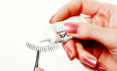 Step2:在涂抹黏合剂时用镊子夹住假睫毛仔细涂抹,注意要仔细涂黏均匀。
