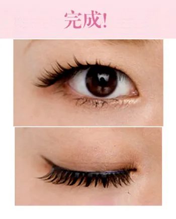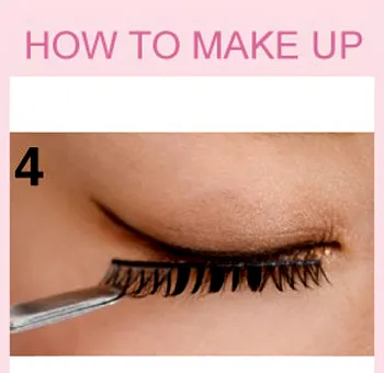 Step4:选择交叉型的假睫毛,在睫毛根部涂上胶水,用镊子辅助粘贴起来。
