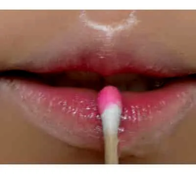 Step9:用润唇膏滋润双唇,等唇纹淡化一点后就可以在唇瓣中间涂上和腮红颜色相近的唇膏。