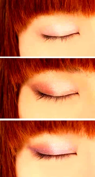 步骤五:选择浅粉色为眼窝打底,然后在眼尾处用深咖色加重效果,最后选择紫色眼影沿着睫毛根部像勾勒眼线一样涂刷。