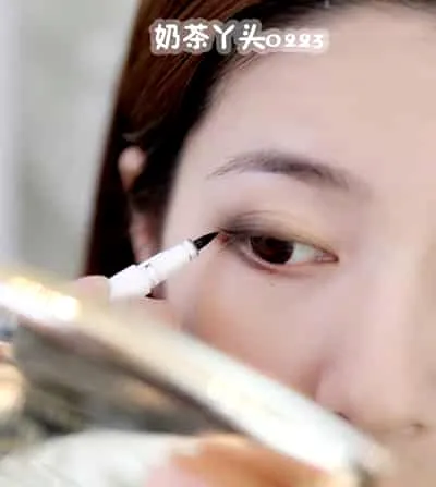 步骤六 :在眼尾使用眼线液描一条,只描眼角的三分之一,将眼线化细,往上微微翘,能使整个眼睛更加的有神。