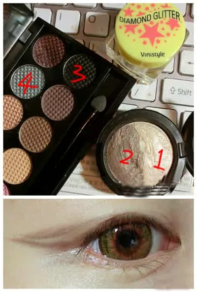 Step1:眼影是Sleek658,MAC双色矿物,Vinistyle闪粉,先用植村秀的古诺棕色轻轻的描一个形状。