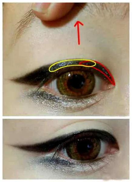 Step2:红色线用1号mac的银白色湿擦,干了以后用vinistyle的闪粉叠擦,蓝色线用mac灰色湿擦,黄线用sleek 658的4号深灰画一个下挂的眼尾。