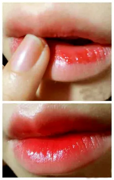 Step7:用一只红色的唇膏,沾到手指上,然后抹在唇部内圈,最后上点润唇膏在唇部中间。