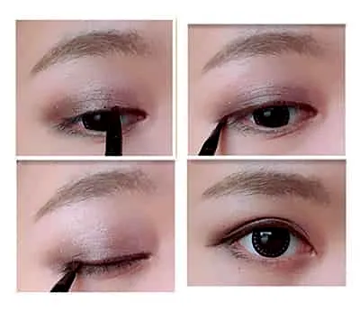 Step6:选择棕色睫毛膏代替黑色,从睫毛根部中间轻轻勾画眼线,在眼尾处稍微延长达到修饰眼型的效果。