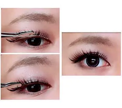 Step7:选择前短后长的假睫毛,在睫毛根部涂上适量的胶水,然后用镊子小心辅助调整弧度。