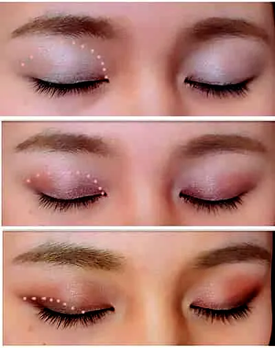 Step5:首先选择珍珠色眼影在整个眼窝处涂满,在双眼皮褶皱处晕染粉色眼影,淡淡的一层即可。最后在眼尾处稍微涂上浅咖色,如图。
