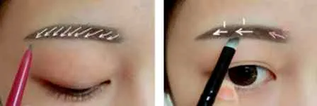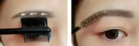 第三步:在画眉毛的时候,按照上图所给的步骤,按照箭头把空隙补上去,再刷上眉粉会均匀些,先刷后面再带到前面,避免眉头过浓。