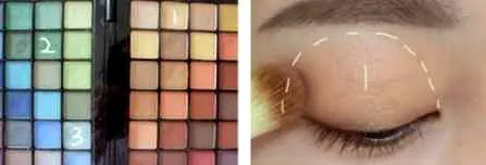第五步:眉毛完成之后,现在选择眼影。因为要符合春天的气息,所以不适宜使用比较浓的眼影,小编推荐使用三种色系的眼影,金色、蓝色和绿色。之后,用金色的眼影将整个眼窝都刷满。