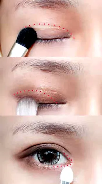 Step6:在眼影盒里找到浅咖色眼影,在眼窝处轻涂然后沿着眼尾及三角区域涂上棕色眼影,最后用干净的眼影棉蘸取白色眼影在眼角处提亮。