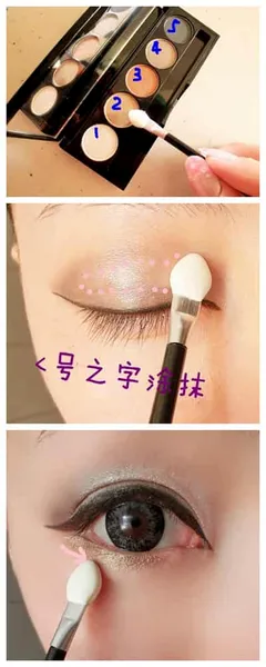 Step7:接下来画眼影了,先在眼球**打上1号,在选用2+3号涂抹。最后叠加5号加重眼尾。在下眼尾3/1处添加眼影3+4,越往内越薄,加强下眼球下面部分。