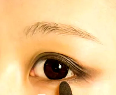 在下眼睑部分可以选择用浅灰色的眼影来稍微的晕染一下,这样就不会显得上眼睑深度过大,**眼睛也会显得更大,并去适量的白色高光粉在眼窝前端晕染,这样眼部会更加有立体感。