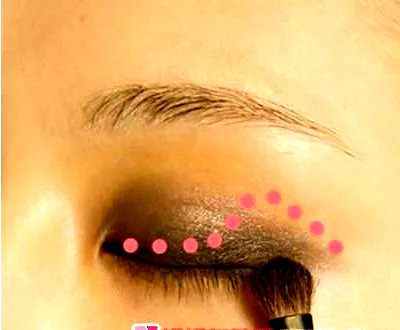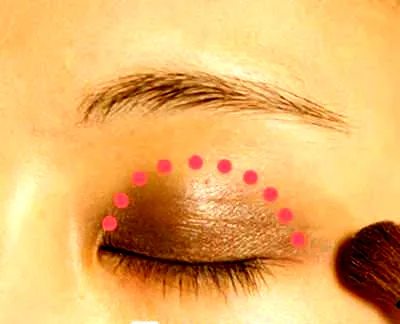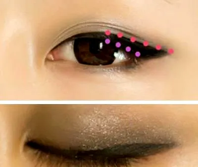 画烟熏妆在眼影上要选择由浅到深的步骤来画,沿着图示的位置涂抹深灰色眼影,并在睫毛根据加强,以增加轮廓感。