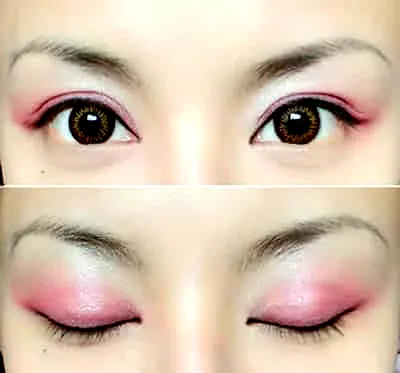 Step9:找到深粉色眼影,在手背上刷掉多余粉末,然后沿着睫毛根部像画眼线一样勾画眼影。