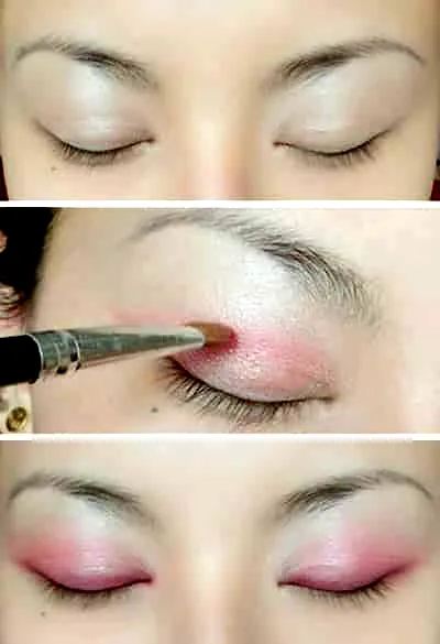 Step8:用干净的眼影刷蘸取淡粉色眼影,从眼窝中间或眼皮褶皱处勾勒一道弧形,然后往下蔓延开,如图。