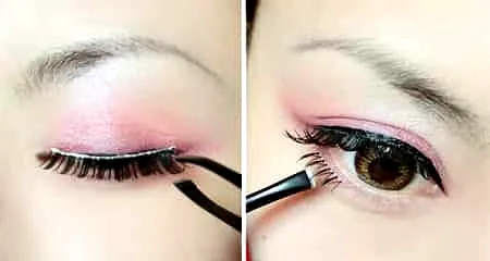 Step11:桃花妆选择的是浓密型假睫毛,在睫毛根部基础适量的胶水,顺着眼线小心的粘贴起来,如图。