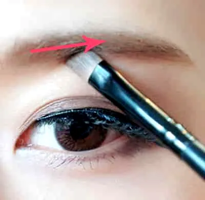 Step7:用一把斜面的化妆刷代替眉刷,蘸取少量的深棕色眉粉顺着眉毛的方向轻描,在眉峰的位置稍微加重颜色。