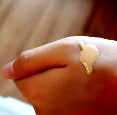 Step1:裸妆对于底妆的要求有点高,首先需要选择一款清爽的BB霜,挤在手背后在全脸均匀的点涂上,然后透过掌心轻轻按压让BB霜更好的服帖肌肤。