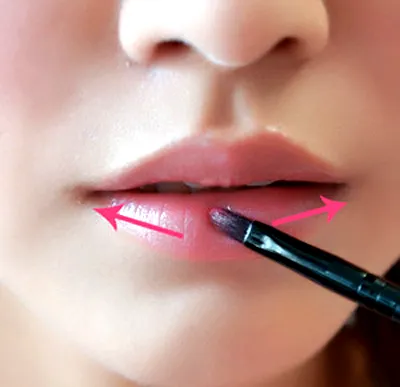 Step11:最后,选择润唇膏在唇部薄涂一层,然后用唇刷蘸取浅粉色唇膏从唇瓣中间向四周延伸涂,如图。