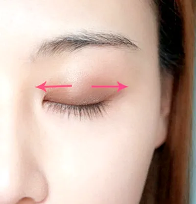 Step2:底妆完成后,就轮到眼妆了。将眼部四周多余的油脂按压掉,然后用眼影棉蘸取少量浅咖色眼影在眼窝处推开,沿着睫毛根部晕染咖色眼影,将两种颜色的眼影混合起来向两边延展。