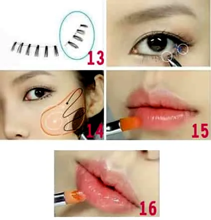 步骤9:刷睫毛,睫毛膏的量不要太多,以免画太浓而使睫毛粘在一起。下眼睫毛分为四部分,从眼尾开始由浓转淡,会显的更为自然。