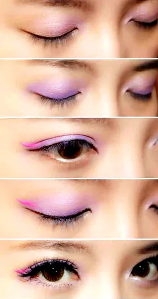 步骤三:为了让眼睛更加的深邃和有诱惑力,选择玫红色的眼线膏,在眼尾处画上一笔,往上卷翘的画一笔。