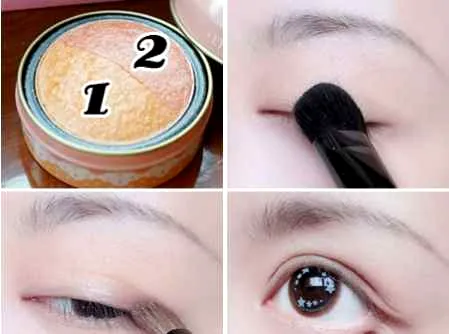 步骤二:基本打底护理好之后,接着对眼部上妆,将具有活力的颜色整个扫在眼皮上,淡粉或者橙色不会很明显,但也会有淡淡的暖**调,与肤色裸妆相称,中心部分可以着重加深一下,带有珠光成分提亮效果会增加,这样眼部会显得更有立体感,然后上下眼尾用2号色淡淡描绘。