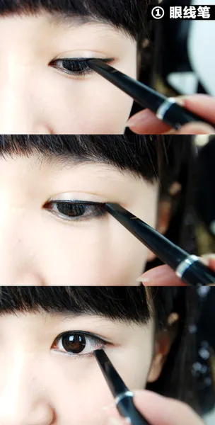 步骤二:眼妆笔(最简单初学者可以运用)全包式,下眼睑画内眼线,注意眼头)在贴近睫毛生长线的位置开始描画上眼线,画上眼线的时候应尽量将内眼线填满,而且画眼线的时候要一笔过,画出来的眼线有流线感,颜色均匀。在睫毛根部与睫毛中间,把空隙给补起来。