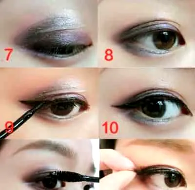Step3:接着用褐色的眼影加深后眼窝和下眼尾。画好上眼线,眼尾拖长稍稍往上翘,打造更有神的双眼,然后贴好假睫毛,使眼睛看起更大,更有魅力。