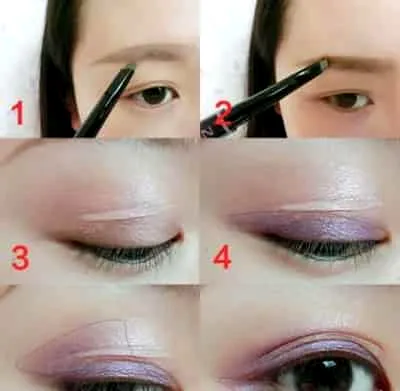 Step2:用咖啡色的眉粉先在眉形上画出一个轮廓,再填充好。贴好双眼皮贴。在眼窝处涂上淡粉色的眼影,在用紫色的眼影涂抹在双眼皮处,如图4,再用紫色的眼影涂抹好后眼窝,再减下眼尾涂抹好,如图6所示位置。