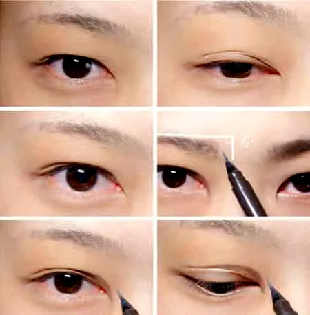 Step1:首先将双眼皮贴上,离睫毛大概0.5厘米的地方,打造出深邃的感觉,接着就是画眉毛,将眉毛画出厚重的感觉,如图四般,成90度的画法,接着就是画眼头,用眉笔现在眼头的部位根据眼头的弧度画一个月亮形状的图,如图六一般。