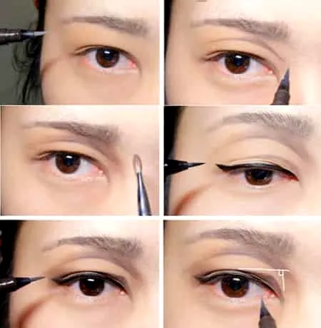 Step3:这个时候刷上一些浅灰色的眼影,接着用眼线笔在眼尾的地方画出一条很粗的眼线即刻,眼头也画出一条延长性的倒三角就OK了。