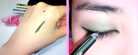 step2:如果眼影选用绿色的,画眼线要用那种绿色带闪的眼线笔,根据自己的眼形贴近睫毛根部轻轻画一条就可以了,内眼线也要填满。