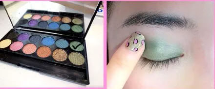 step1:准备用绿色的眼影,也可以选择自己喜好颜色的眼影,跟着步骤画就行了。选单色就OK了,在眼尾部分深一点。