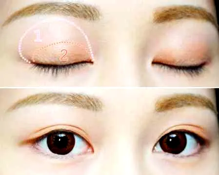 步骤三:接下来就是上眼影,先用珠光色的眼影大面积的打底,然后使用橘色的眼影在褶皱处刷上一层即可。