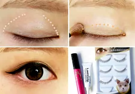 Step2:指腹蘸取白色眼影,薄薄的在眼窝处打底,然后在睫毛根部往上晕染0.5cm的咖色眼影。选择防水效果好的眼线液勾画俏皮的上扬眼线,在眼线上粘贴自然型假睫毛,并刷上睫毛膏,让眼妆更自然。