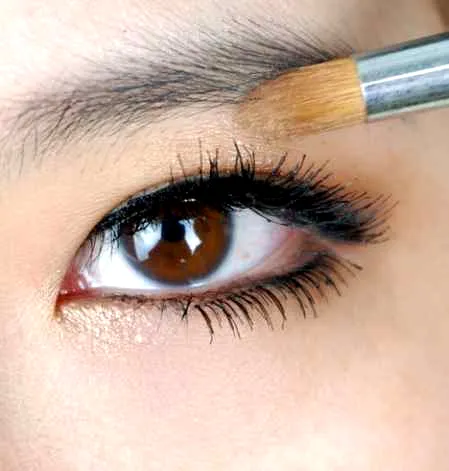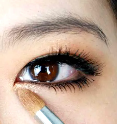 STEP 3:然后用黑色的眼影从眼皮根部开始向上晕染,盖过双眼皮贴。