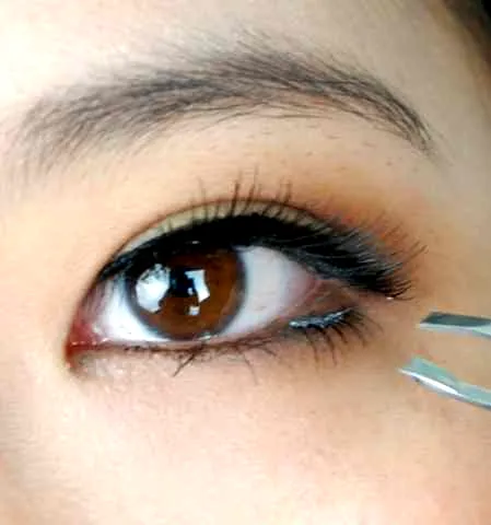 STEP 8:将假睫毛紧贴在睫毛根部,下眼睑需要分段的假睫毛。