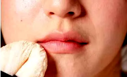 STEP1:用粉扑沾取蜜粉刷在唇上,就能够退去光泽制造出雾面感。