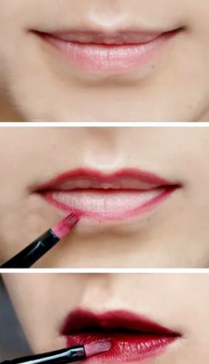 步骤六:先用裸色唇膏进行打底,然后用唇线笔勾勒出唇形,再用酒红色唇膏全部填满。