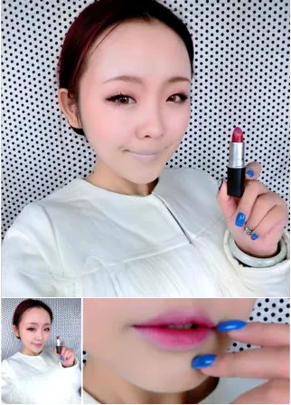 STEP6:先给唇部打底,然后选用玫红色的口红涂抹在中间的位置,用手指慢慢往外面晕染。