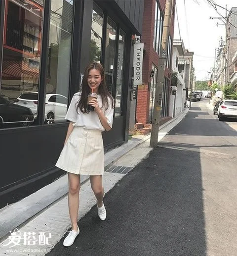 米色是夏季的常见流行色,一件米色T恤搭配同色系的A字裙,再加上平底小白鞋,特别的清新温柔。