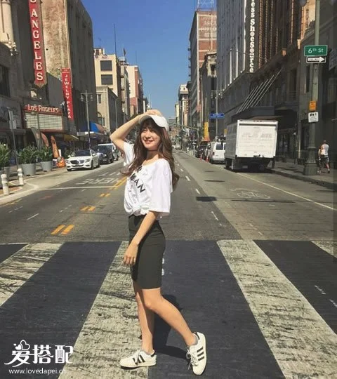 黑白配是永恒的时尚,白色字母T恤搭配黑色一步裙,白色sneakers运动鞋负责舒适和时尚。