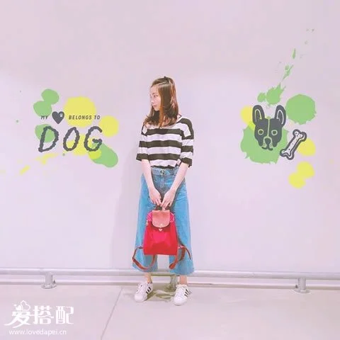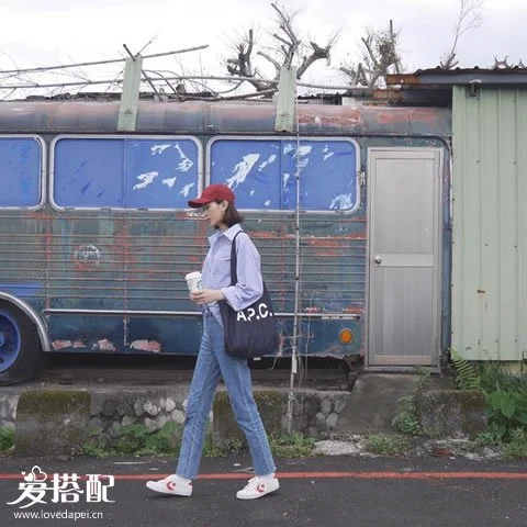 如果想穿的更有内容一些,选择红色条纹的小白鞋,用同色系的帽子来呼应色彩,整体的“蓝+红”特别的时髦。